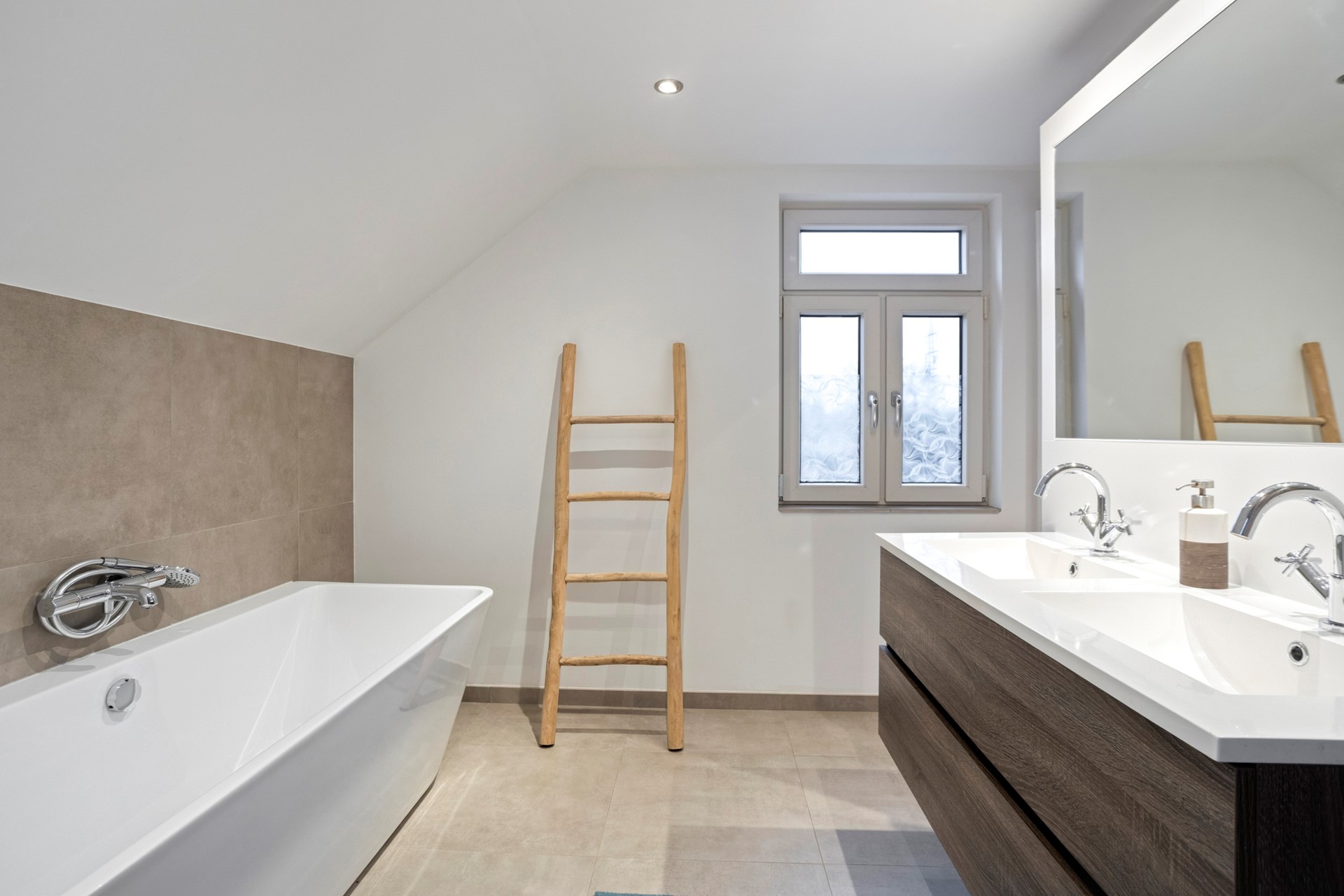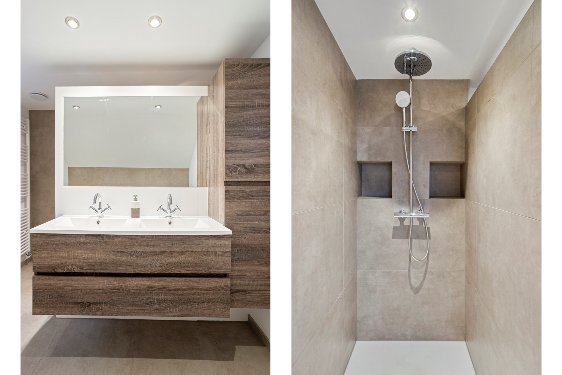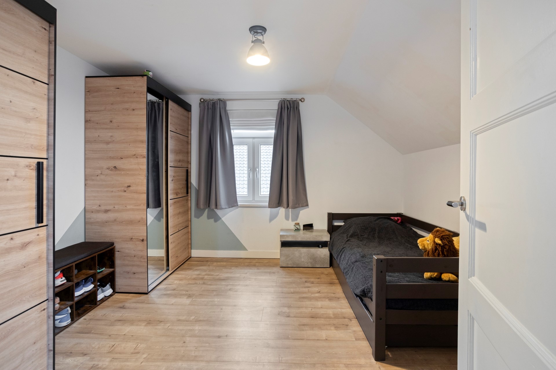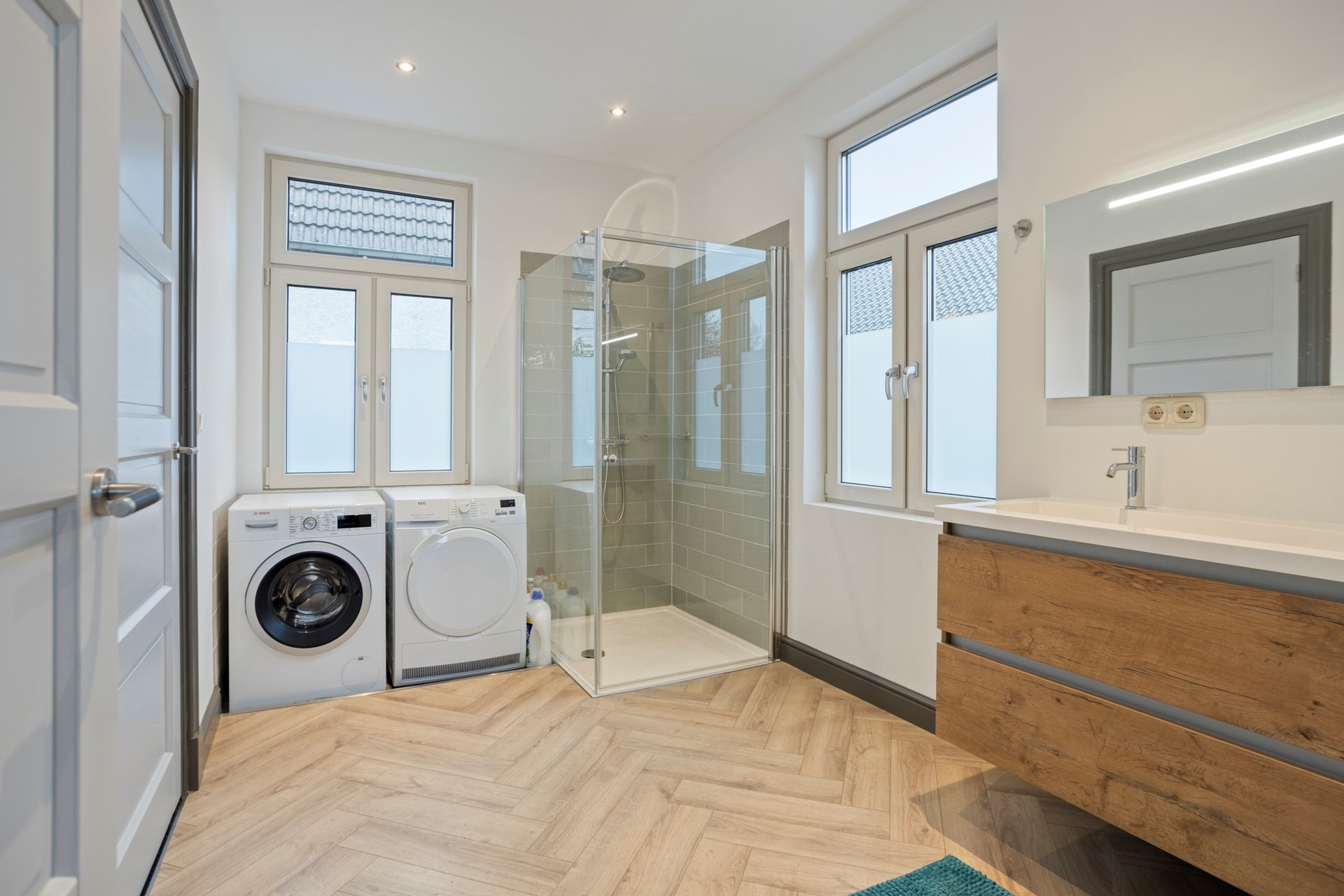 Op de eerste verdieping bevinden zich de overloop, 3 slaapkamers, een badkamer en een apart toilet. De overloop en slaapkamers zijn afgewerkt met een doorlopende laminaatvloer en de slaapkamers zijn respectievelijk circa 13, 12 en 9 m² groot. De moderne en complete badkamer (ca. 8,5 m²) is voorzien van een ligbad, grote inloopdouche, dubbele wastafel in badkamermeubel.