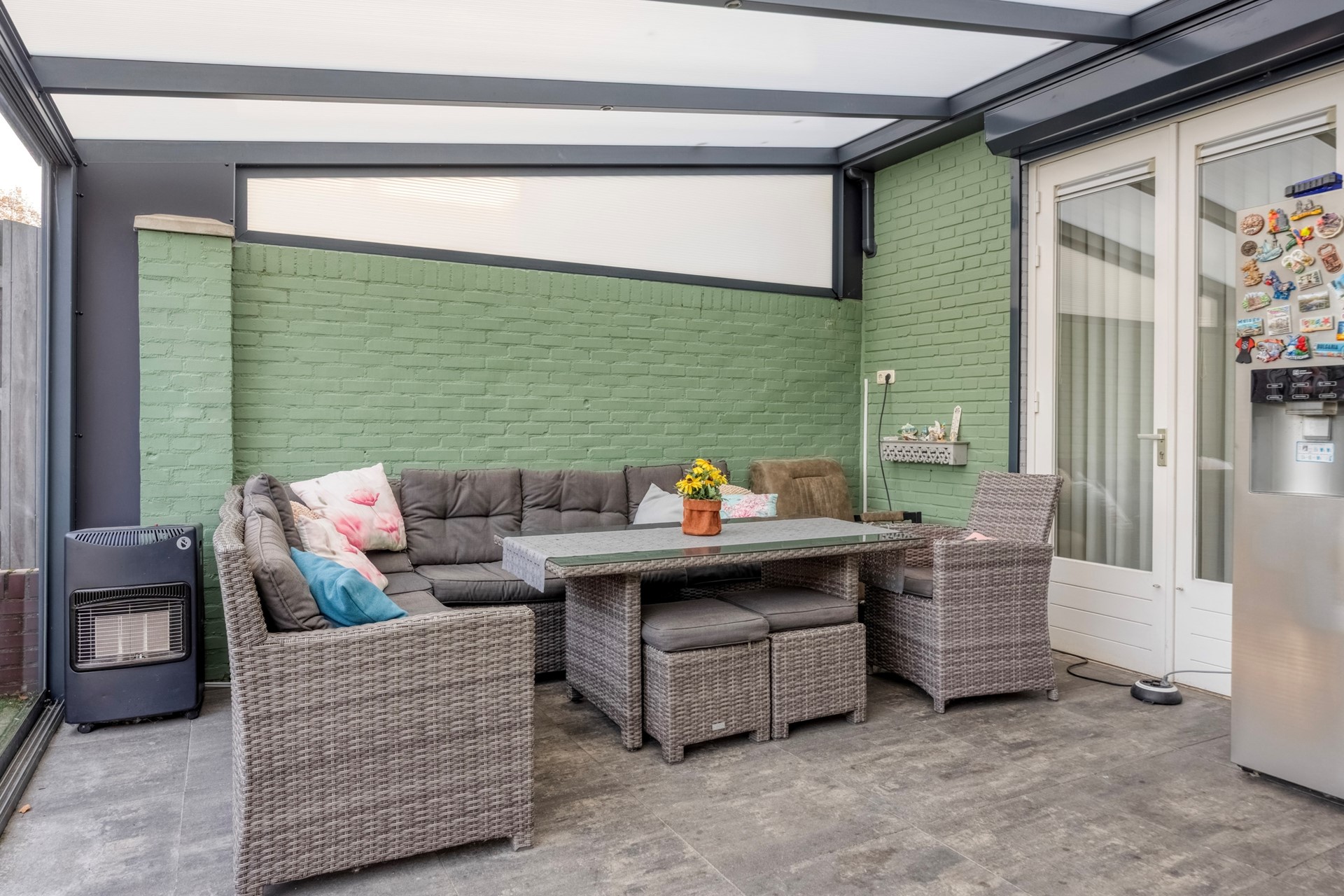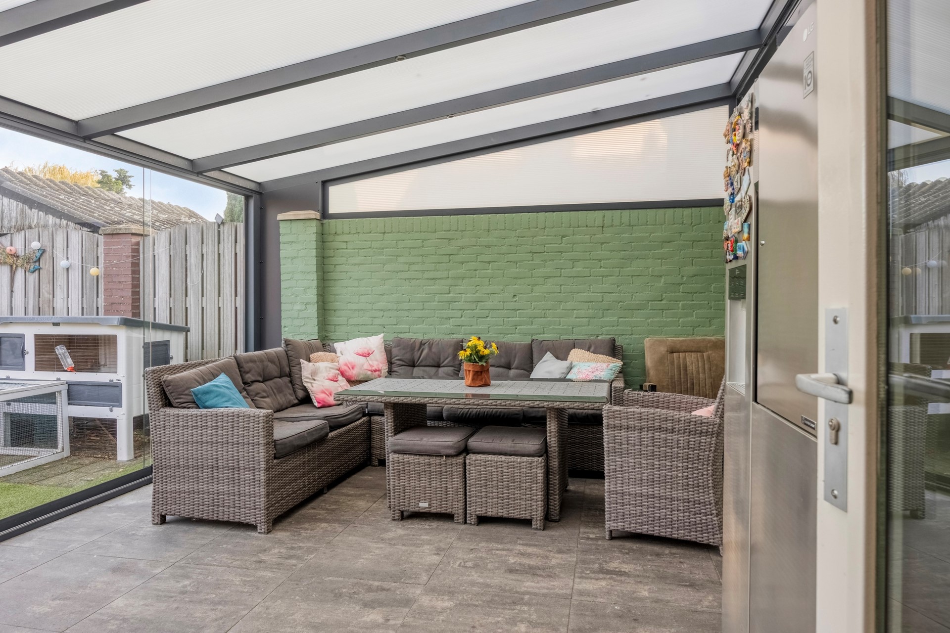 De achtertuin is onderhoudsvriendelijk aangelegd, biedt voldoende privacy en is voorzien van kunstgras, bestrating en borders met beplanting.