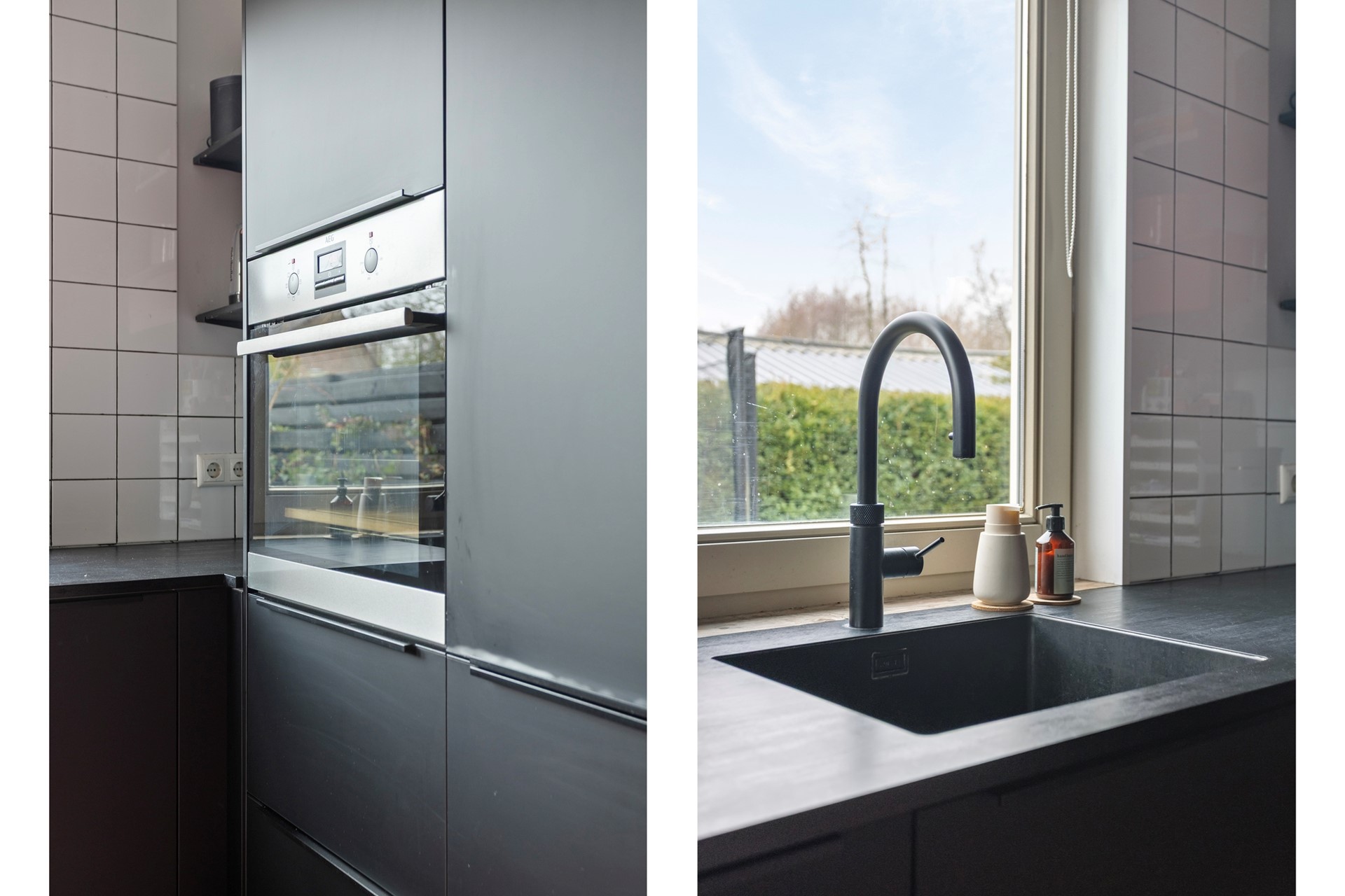 De overdekte entree geeft toegang tot de voordeur en de hal. Vanuit de hal met meterkast en trap naar de 1e verdieping zijn de kelder en de keuken bereikbaar. De open keuken beschikt over veel lichtinval door de fijne raampartij met zicht op de tuin. De keuken is voorzien van een moderne keukenopstelling met apparatuur (inductiekookplaat met afzuiging, oven, vaatwasser, koelkast) en voldoende werk- en kastruimte. De fraaie woonkamer is ruim van opzet (ca. 35 m²) en heeft veel lichtinval door de raam aan de voorzijde en de openslaande deuren aan de achterzijde naar de tuin. In de praktische bijkeuken bevinden zich de witgoedaansluitingen, de toiletruimte en een deur naar de tuin. De toiletruimte is voorzien van een wandcloset met fonteintje. De slaapkamer op de begane grond is voorzien van een laminaatvloer en hoog plafond en een deur met toegang naar de tuin.