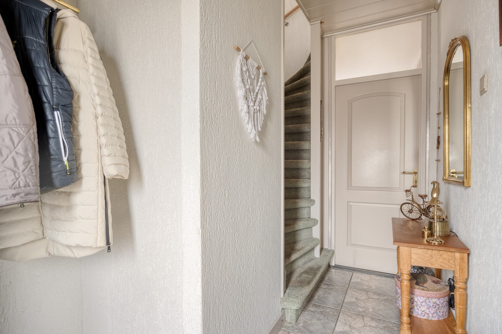 De entree geeft toegang tot de voordeur en de hal. Vanuit de hal met tegelvloer, garderoberuimte, meterkast, en trap naar de 1e verdieping is de woonkamer bereikbaar. De L-vormige woonkamer is ruim van opzet (ca. 33 m²), heeft veel lichtinval mede door de openslaande deuren naar het terras en is voorzien van een tegelvloer met vloerverwarming.