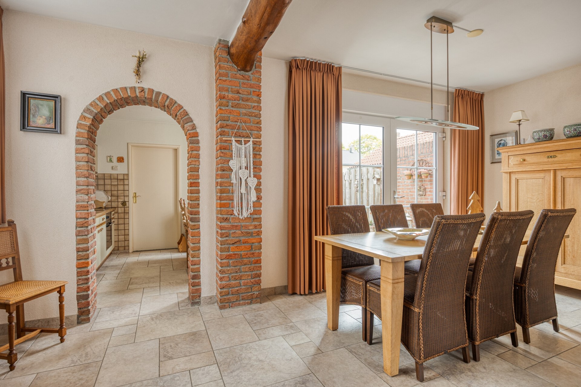De keuken (ca. 9 m²) is eveneens voorzien van een tegelvloer met vloerverwarming en een keukenopstelling met apparatuur (elektrische kookplaat, afzuigkap, oven, koelkast) en beschikt over voldoende werk- en kastruimte. Aansluitend aan de keuken is de bijkeuken (ca. 6 m²) gesitueerd. Deze is voorzien van een tegelvloer, de witgoedaansluitingen en loopdeuren naar de oprit en naar de tuin. Hier bevindt zich ook de toiletruimte welke voorzien is van een wandcloset met fonteintje.